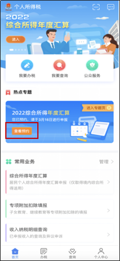 所得税APP后,可通过“首页――2022综合所得年度汇算”专题区域点击“去预约”进入预约功能页面,也可以通过“办税――税费申报――综合所得年度汇算申报预约”进入预约功能界面。