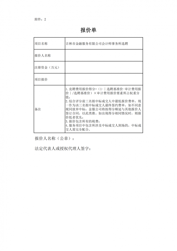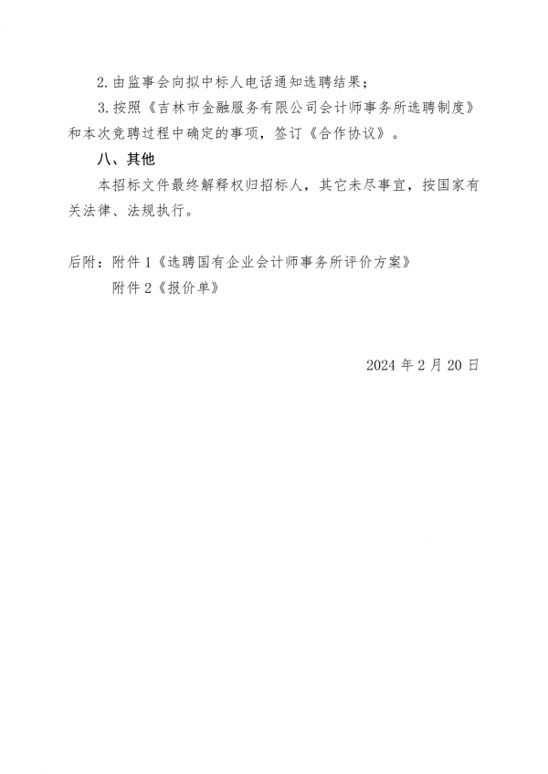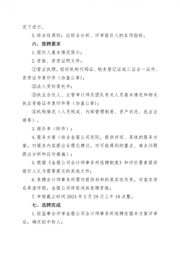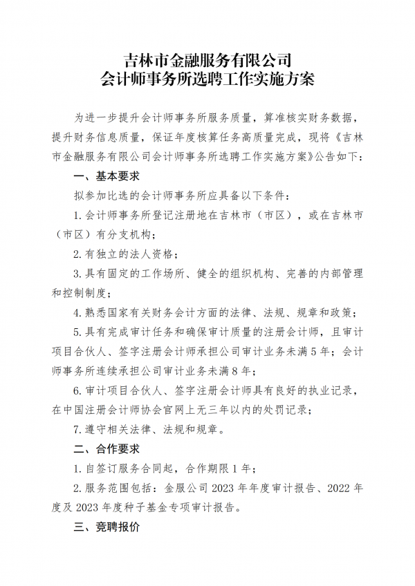 根据《中华人民共和国公司法》《中华人民共和国会计法》《中华人民共和国注册会计师法》以及《国有企业、上市公司选聘会计师事务所管理办法》(财会〔2023〕4 号)等有关规定,为进一步提升会计师事务所服务质量,算准核实财务数据,提升财务信息质量,保证年度核算任务高质量完成,吉林市金融服务有限公司拟对会计师事务所进行选聘,公告如下: