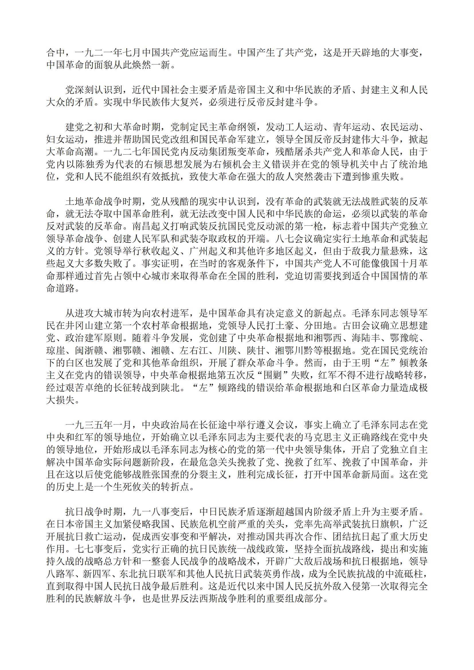 第一部分“夺取新民主主义革命伟大胜利”。阐明这一时期党面临的主要任务是,反对帝国主义、封建主义、官僚资本主义,争取民族独立、人民解放,为实现中华民族伟大复兴创造根本社会条件。分析党产生的历史背景,总结党领导人民在建党之初和大革命时期、土地革命战争时期、抗日战争时期、解放战争时期进行革命斗争的历史进程和创造的伟大成就,以及创立毛泽东思想、实施和推进党的建设伟大工程的重大成就。强调成立中华人民共和国,实现民族独立、人民解放,实现了中国从几千年封建专制政治向人民民主的伟大飞跃;中国共产党和中国人民以英勇顽强的奋斗向世界庄严宣告,中国人民从此站起来了,中华民族任人宰割、饱受欺凌的时代一去不复返了,中国发展从此开启了新纪元。