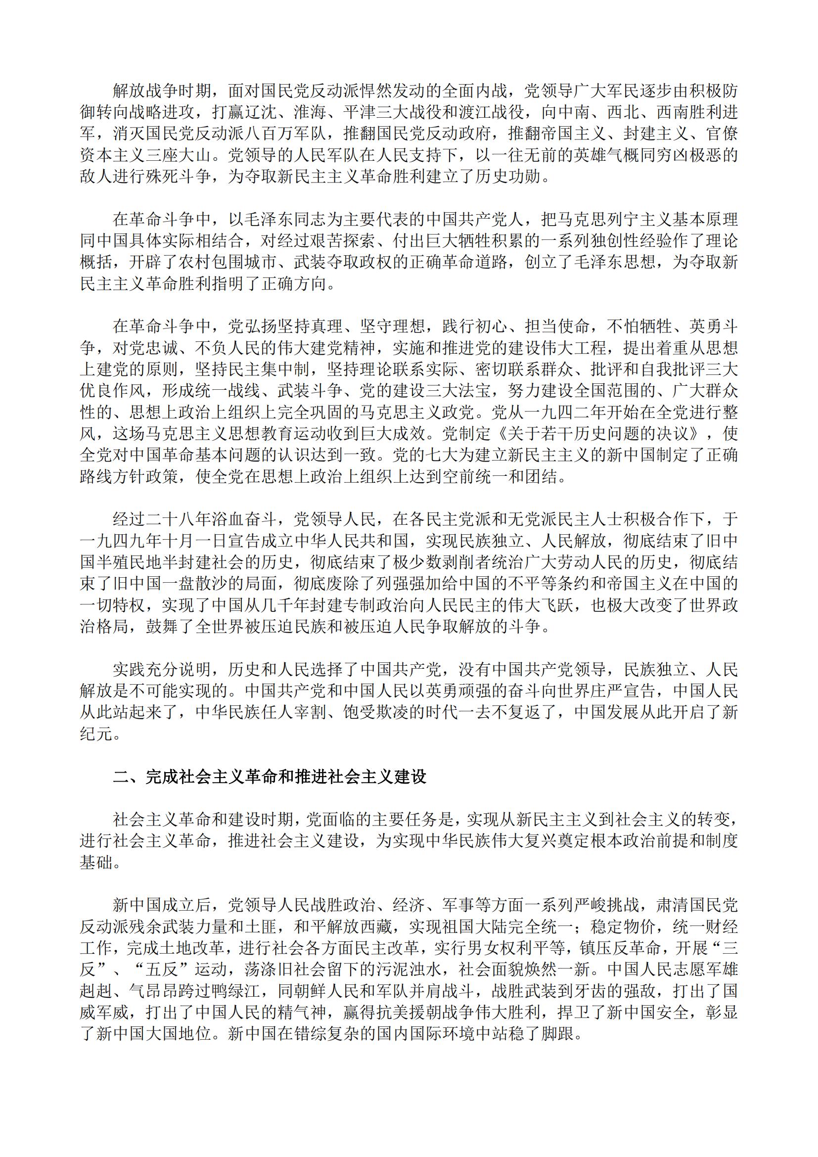 第二部分“完成社会主义革命和推进社会主义建设”。阐明这一时期党面临的主要任务是,实现从新民主主义到社会主义的转变,进行社会主义革命,推进社会主义建设,为实现中华民族伟大复兴奠定根本政治前提和制度基础。总结新中国成立后党领导人民战胜一系列严峻挑战、巩固新生政权,成功完成社会主义改造、建立社会主义制度,开展全面的大规模的社会主义建设,打开对外工作新局面的历史进程和创造的伟大成就。总结党加强执政党建设所作的努力和积累的初步经验,在阐述这一时期党取得的独创性理论成果的基础上,对毛泽东思想进行科学评价。强调这一时期党领导人民创造的伟大成就,实现了一穷二白、人口众多的东方大国大步迈进社会主义社会的伟大飞跃;中国共产党和中国人民以英勇顽强的奋斗向世界庄严宣告,中国人民不但善于破坏一个旧世界、也善于建设一个新世界,只有社会主义才能救中国,只有社会主义才能发展中国。