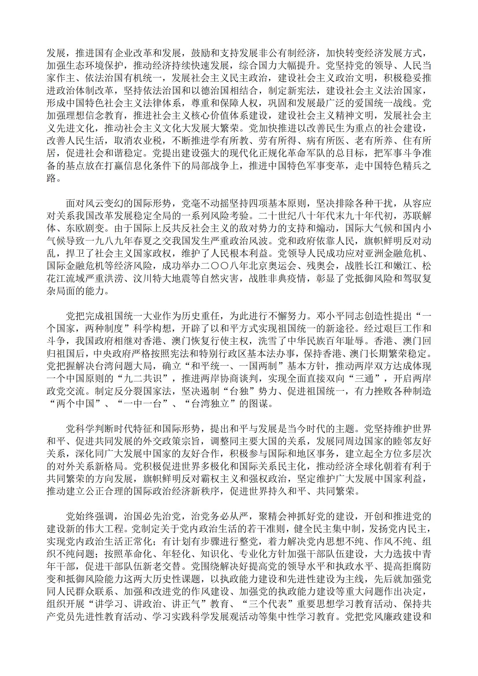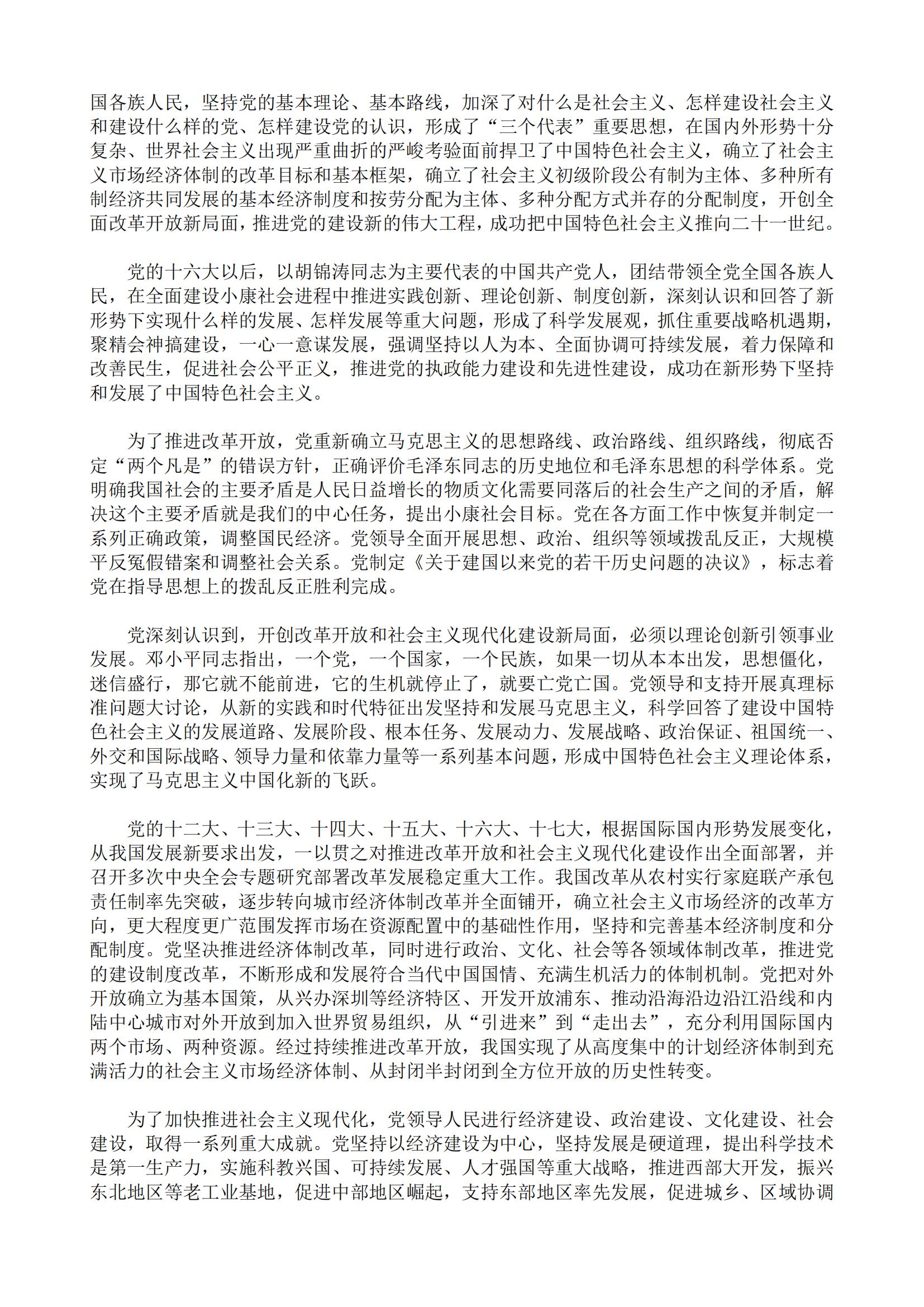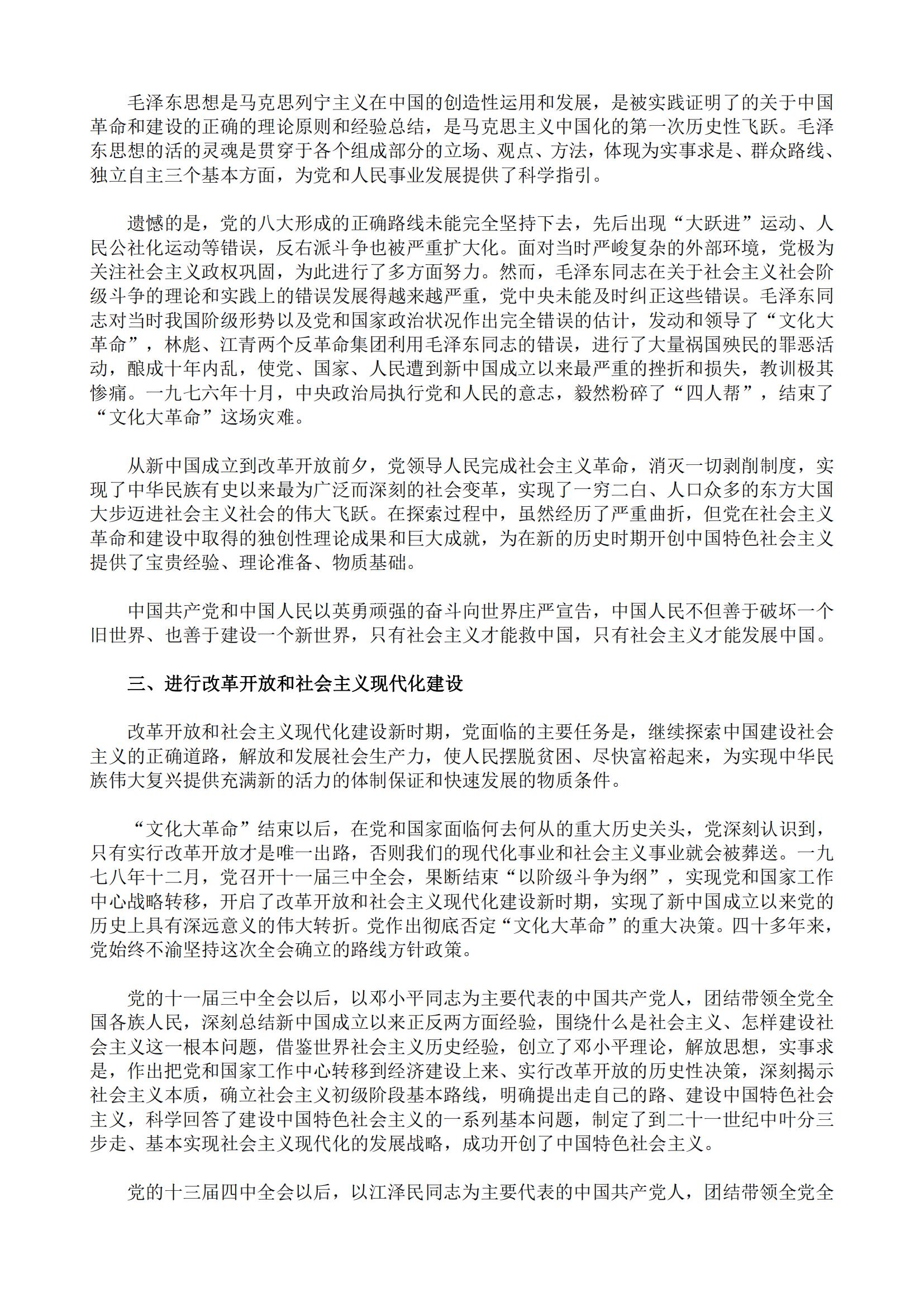 第三部分“进行改革开放和社会主义现代化建设”。阐明这一时期党面临的主要任务是,继续探索中国建设社会主义的正确道路,解放和发展社会生产力,使人民摆脱贫困、尽快富裕起来,为实现中华民族伟大复兴提供充满新的活力的体制保证和快速发展的物质条件。强调党的十一届三中全会的历史意义,总结以邓小平同志为主要代表的中国共产党人、以江泽民同志为主要代表的中国共产党人、以胡锦涛同志为主要代表的中国共产党人作出的历史贡献,从党领导全面开展拨乱反正、形成中国特色社会主义理论体系、推进改革开放和社会主义现代化建设、从容应对关系我国改革发展稳定全局的一系列风险考验、推进祖国统一大业、维护世界和平与促进共同发展、开创和推进党的建设新的伟大工程等方面,展现新时期波澜壮阔的历史画卷和举世瞩目的伟大成就。强调这一时期党领导人民创造的伟大成就,推进了中华民族从站起来到富起来的伟大飞跃;中国共产党和中国人民以英勇顽强的奋斗向世界庄严宣告,改革开放是决定当代中国前途命运的关键一招,中国特色社会主义道路是指引中国发展繁荣的正确道路,中国大踏步赶上了时代。
