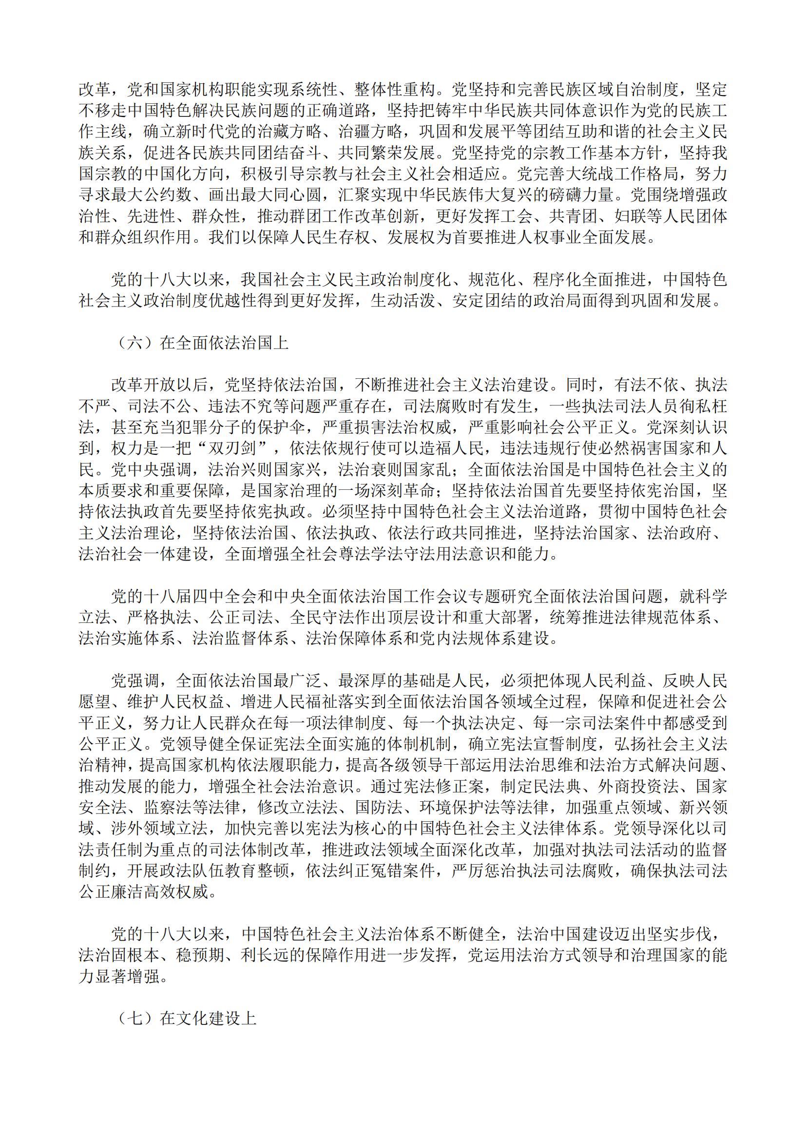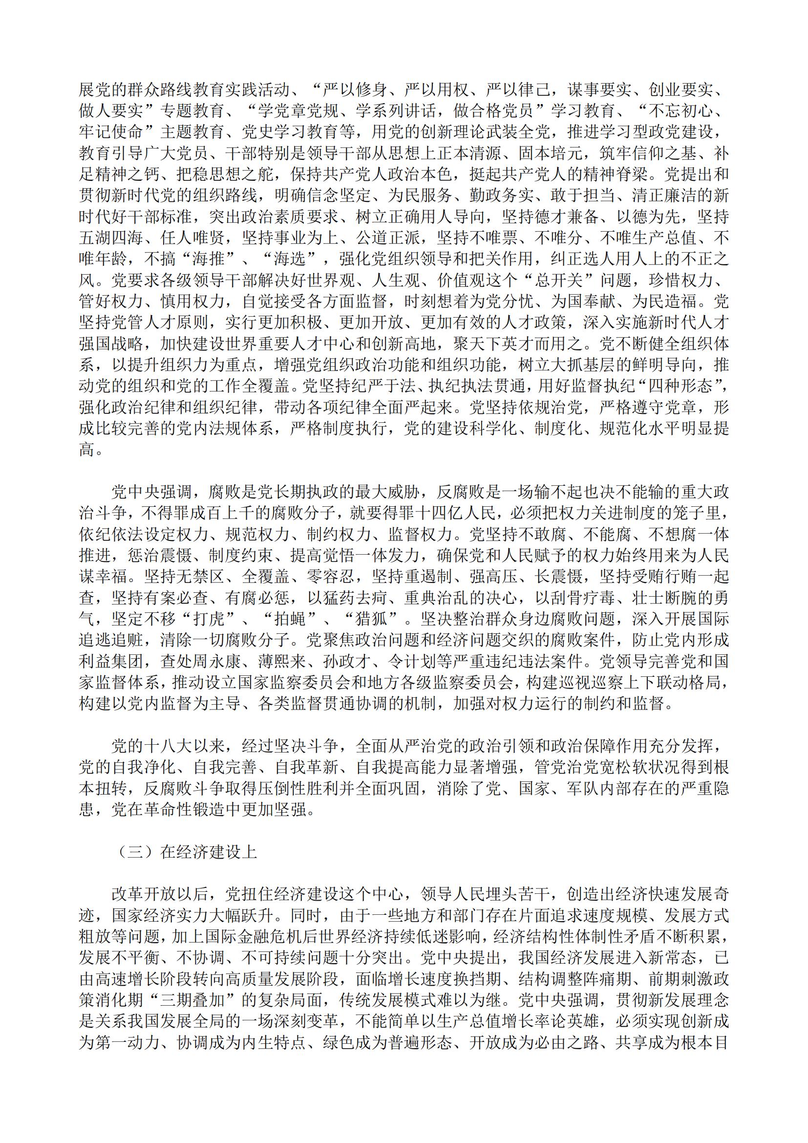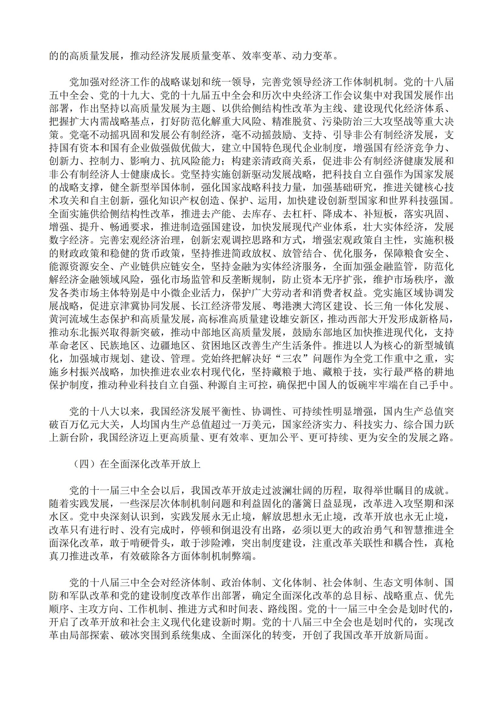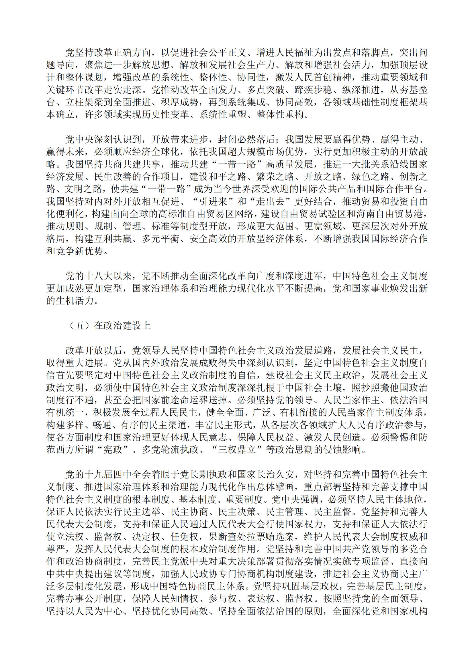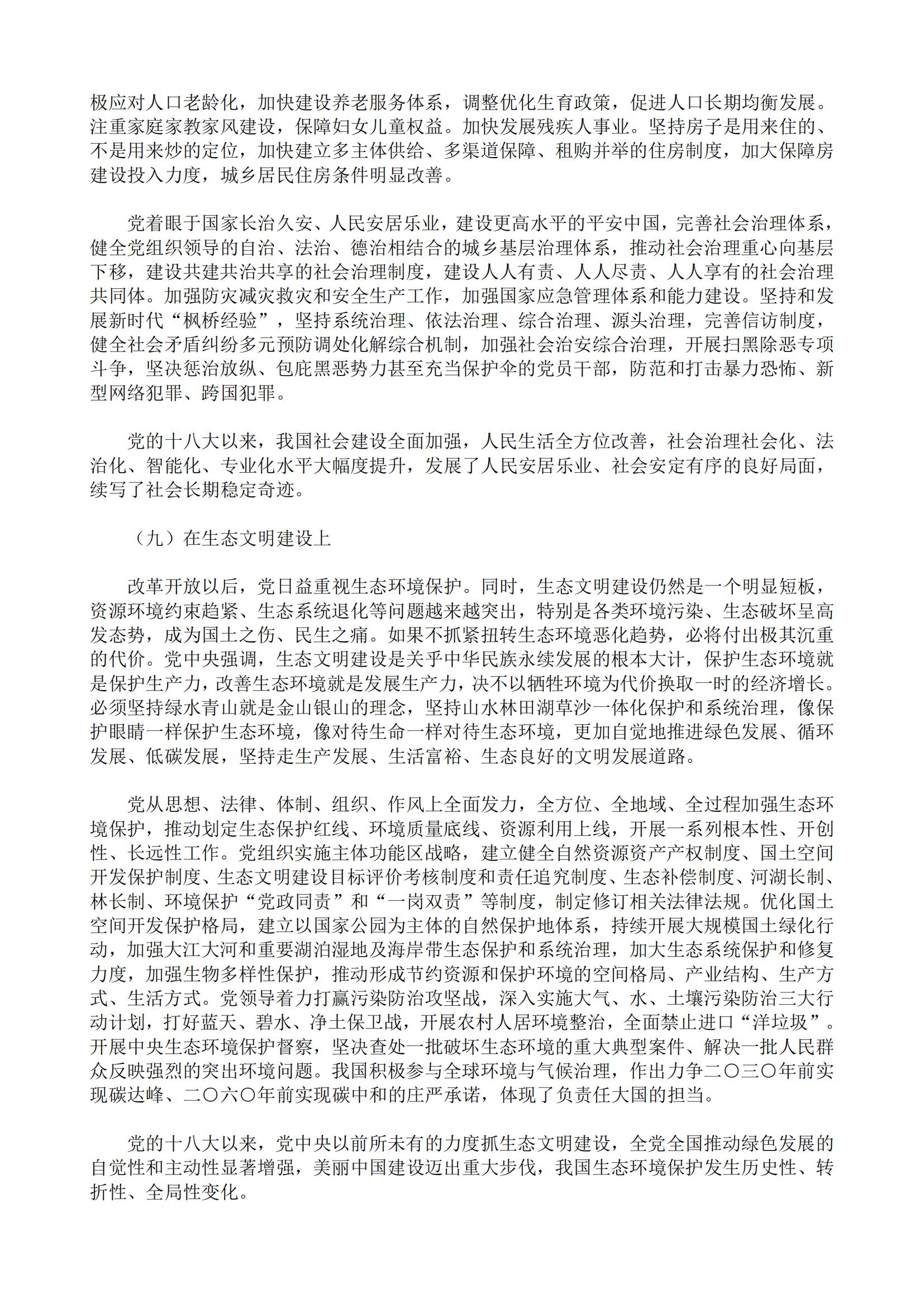 第四部分“开创中国特色社会主义新时代”。阐明这一时期党面临的主要任务是,实现全面建成小康社会的第一个百年奋斗目标,开启全面建成社会主义现代化强国的第二个百年奋斗目标新征程,朝着实现中华民族伟大复兴的宏伟目标继续前进。阐述中国特色社会主义新时代这一我国发展新的历史方位,概括党的十八大以来党的理论创新成果,深入分析新时代党面临的形势、面对的风险挑战,从坚持党的全面领导、全面从严治党、经济建设、全面深化改革开放、政治建设、全面依法治国、文化建设、社会建设、生态文明建设、国防和军队建设、维护国家安全、坚持“一国两制”和推进祖国统一、外交工作等13个方面,分领域总结新时代党和国家事业取得的历史性成就、发生的历史性变革,重点总结九年来的原创性思想、变革性实践、突破性进展、标志性成果。强调这一时期党领导人民创造的伟大成就,为实现中华民族伟大复兴提供了更为完善的制度保证、更为坚实的物质基础、更为主动的精神力量;中国共产党和中国人民以英勇顽强的奋斗向世界庄严宣告,中华民族迎来了从站起来、富起来到强起来的伟大飞跃。