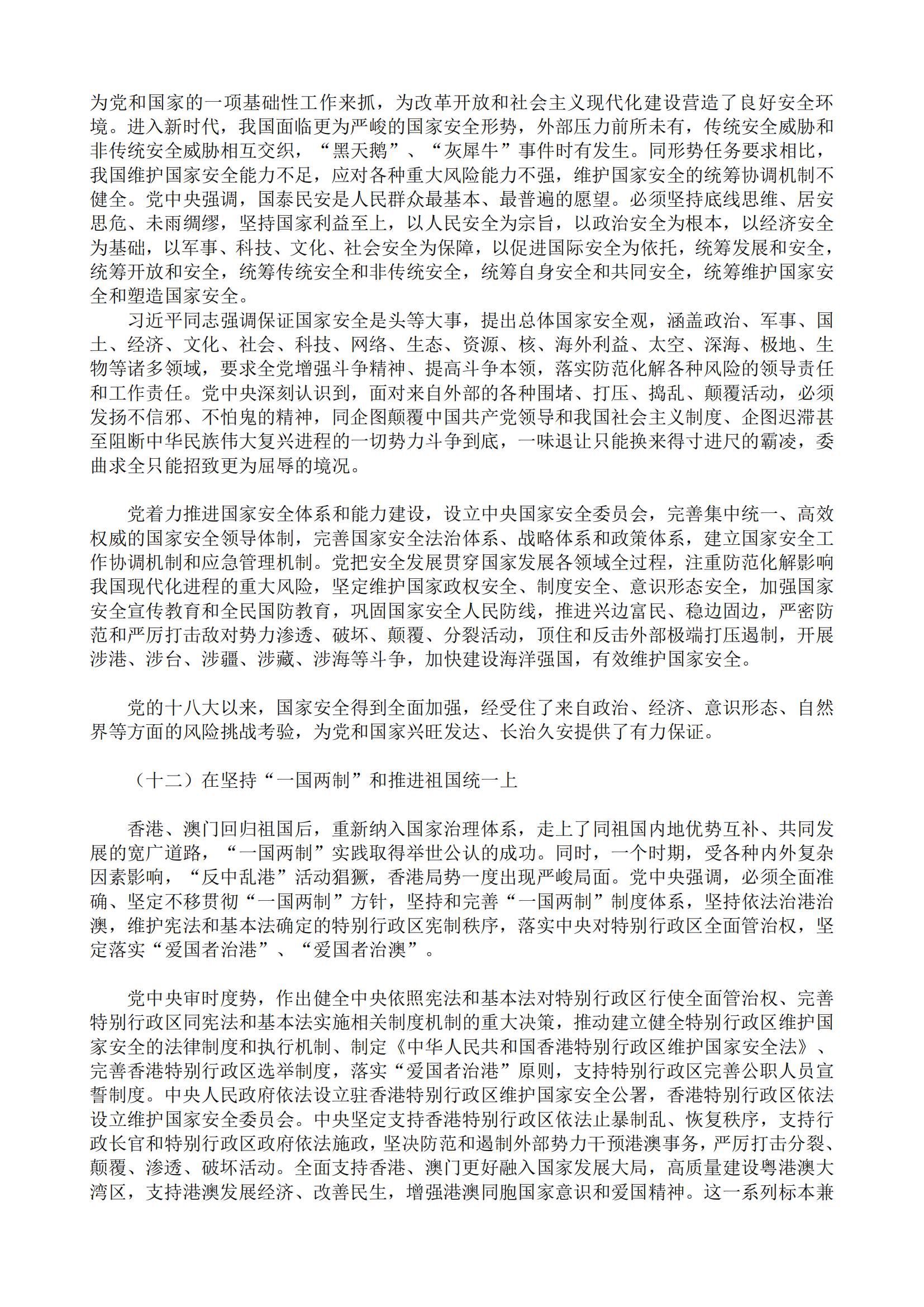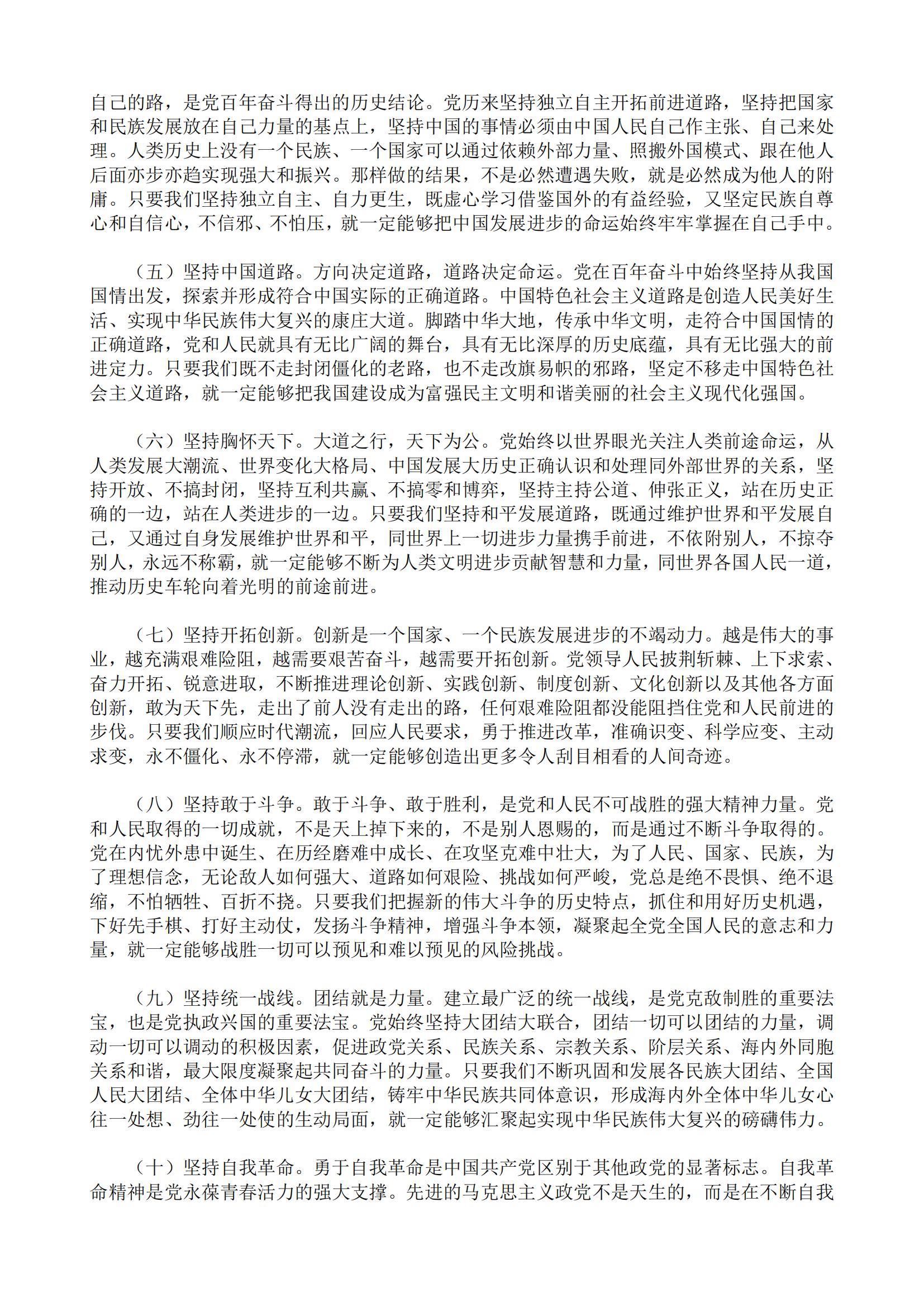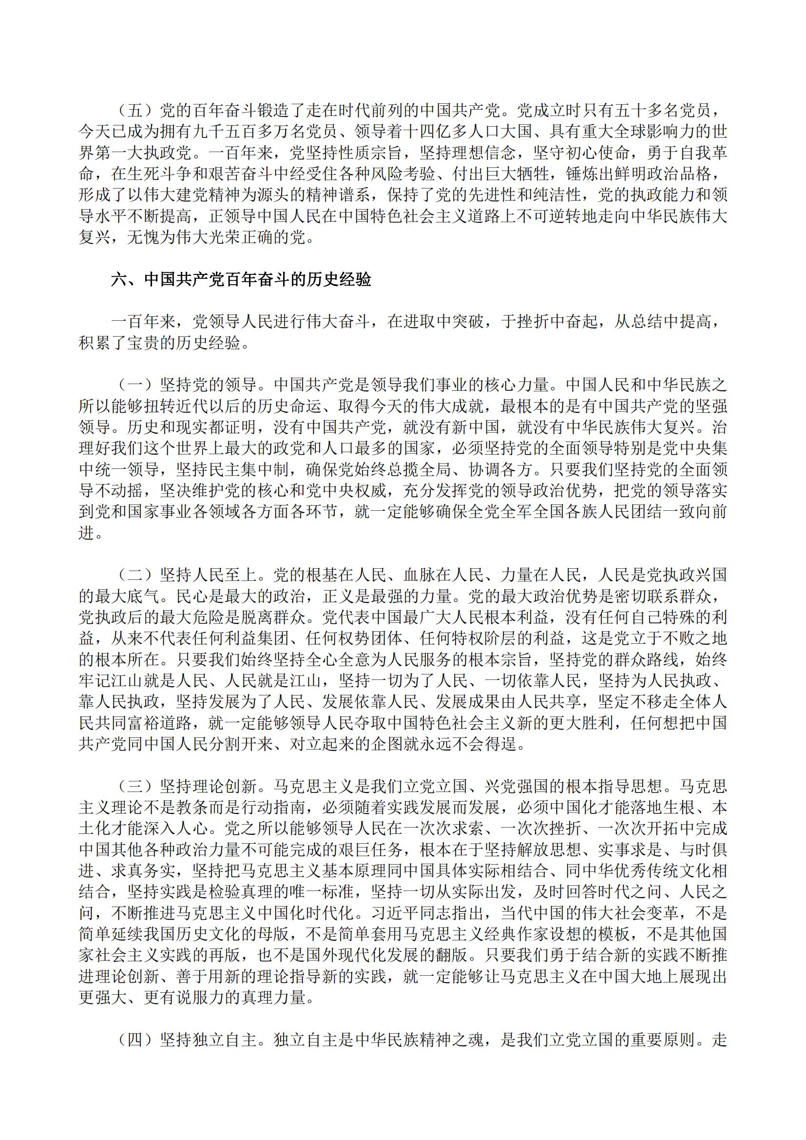 第六部分“中国共产党百年奋斗的历史经验”。概括了具有根本性和长远指导意义的十条历史经验,即坚持党的领导、坚持人民至上、坚持理论创新、坚持独立自主、坚持中国道路、坚持胸怀天下、坚持开拓创新、坚持敢于斗争、坚持统一战线、坚持自我革命。这十条历史经验是系统完整、相互贯通的有机整体,揭示了党和人民事业不断成功的根本保证,揭示了党始终立于不败之地的力量源泉,揭示了党始终掌握历史主动的根本原因,揭示了党永葆先进性和纯洁性、始终走在时代前列的根本途径。强调这十条历史经验是经过长期实践积累的宝贵经验,是党和人民共同创造的精神财富,必须倍加珍惜、长期坚持,并在新时代实践中不断丰富和发展。