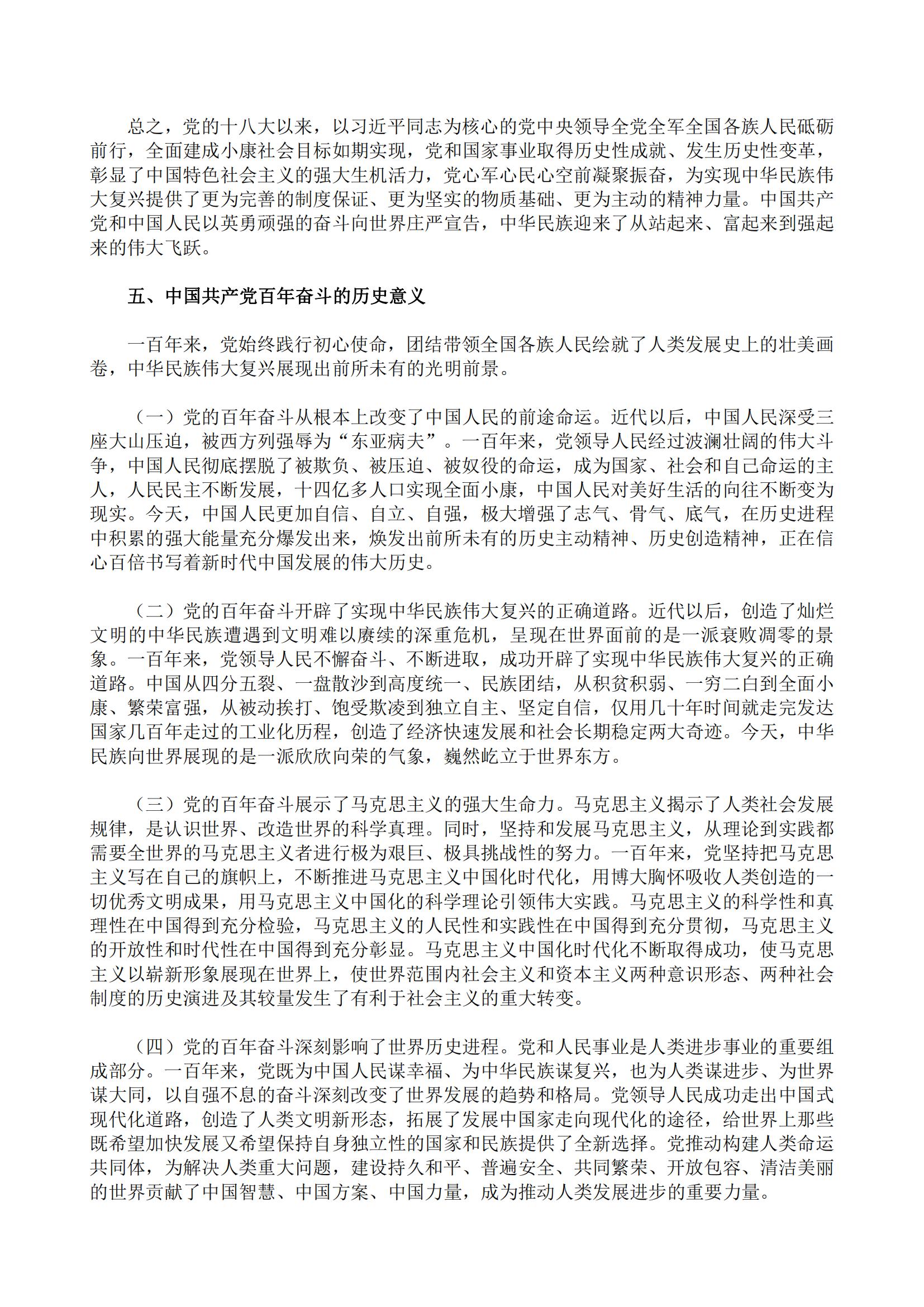 党中央认为,在党成立一百周年的重要历史时刻,在党和人民胜利实现第一个百年奋斗目标、全面建成小康社会,正在向着全面建成社会主义现代化强国的第二个百年奋斗目标迈进的重大历史关头,全面总结党的百年奋斗重大成就和历史经验,对推动全党进一步统一思想、统一意志、统一行动,团结带领全国各族人民夺取新时代中国特色社会主义新的伟大胜利,具有重大现实意义和深远历史意义。
