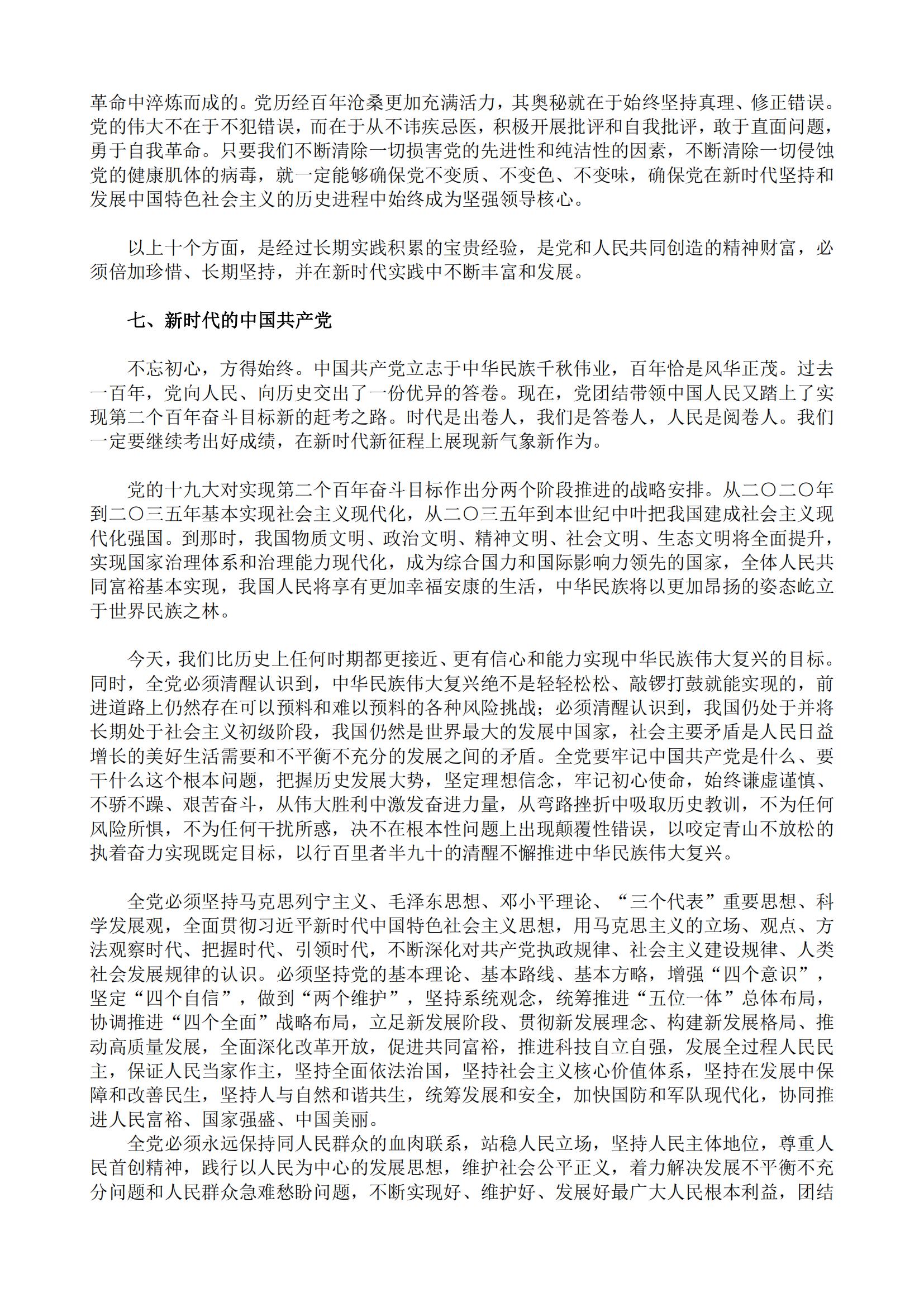 第七部分“新时代的中国共产党”。围绕实现第二个百年奋斗目标,强调全党要以咬定青山不放松的执着奋力实现既定目标,以行百里者半九十的清醒不懈推进中华民族伟大复兴;强调必须坚持党的基本理论、基本路线、基本方略,立足新发展阶段、贯彻新发展理念、构建新发展格局、推动高质量发展,协同推进人民富裕、国家强盛、中国美丽;强调必须永远保持同人民群众的血肉联系,不断实现好、维护好、发展好最广大人民根本利益;强调必须铭记生于忧患、死于安乐,常怀远虑、居安思危,继续推进新时代党的建设新的伟大工程;强调必须抓好后继有人这个根本大计。号召全党全军全国各族人民勿忘昨天的苦难辉煌,无愧今天的使命担当,不负明天的伟大梦想,以史为鉴、开创未来,埋头苦干、勇毅前行,为实现第二个百年奋斗目标、实现中华民族伟大复兴的中国梦而不懈奋斗。