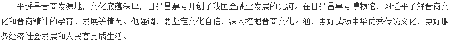 用和开展特色经营情况,并购买了平遥牛肉、饺子醋等年货,还参与了陈醋发酵打耙。他指出,要做优秀传统文化传承者,保护好推光漆器等文化瑰宝,把富有民族特色的传统文化产业发扬