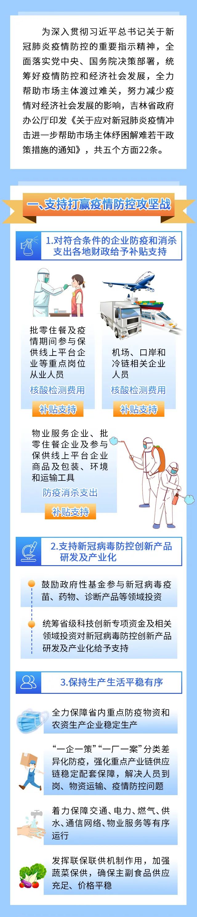 4 月3日,吉林省人民政府办公厅印发了《关于应对新冠肺炎疫情冲击进一步帮助市场主体纾困解难若干政策措施的通知》,聚焦防控攻坚、降本减负、金融支持 、援企稳岗、困难行业帮扶等方面。
