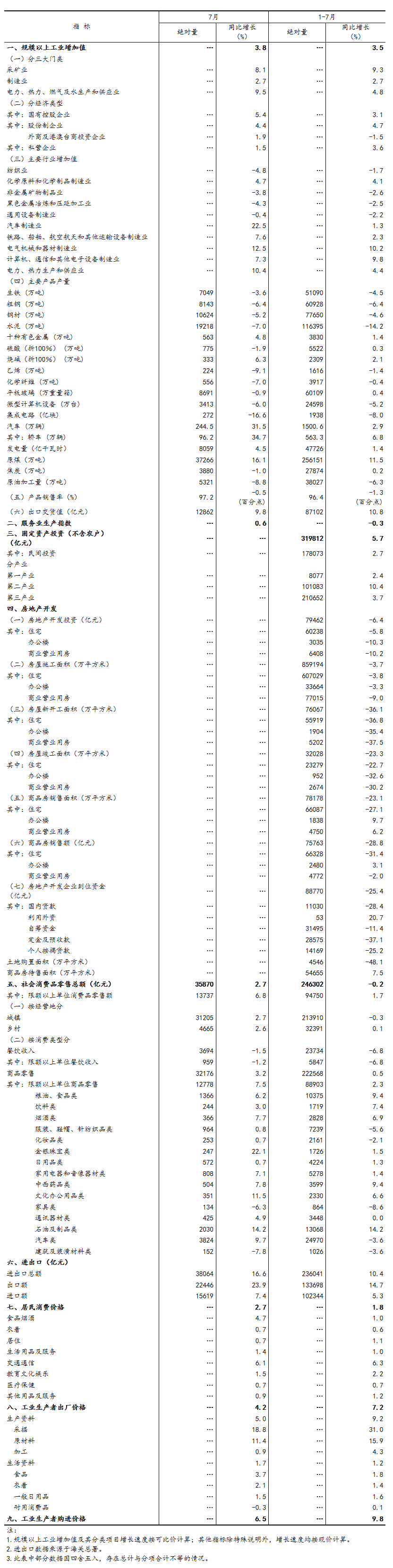 产品产量同比分别增长112.7%、33.9%。1-7月份,全国规模以上工业增加值同比增长3.5%,比1-6月份加快0.1个百分点。7月份,制造业采购经理指数为49.0%,企业生产经营活动预期指数