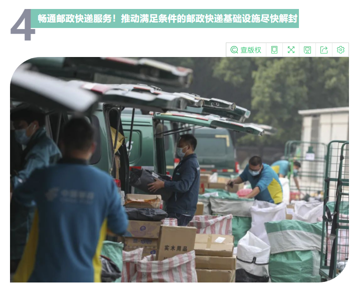 推动地方政府,对于已经关停的邮政快递基础设施,满足解封条件的要尽快有序解封,对于承担防疫物资、民生物资和重要生产生活物资寄递的,要按程序优先解