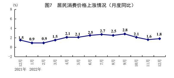 6.8%,粮食价格上涨2.8%,鲜菜价格上涨2.8%,鲜果价格上涨12.9%。扣除食品和能源价格后的核心CPI上涨0.9%。12月份,居民消费价格同比上涨1.8%,环比持平。全年工业生产者出厂