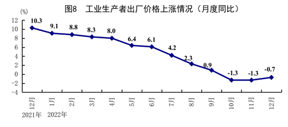 价格比上年上涨4.1%;12月份同比下降0.7%,环比下降0.5%。全年工业生产者购进价格比上年上涨6.1%;12月份同比上涨0.3%,环比下降0.4%。
