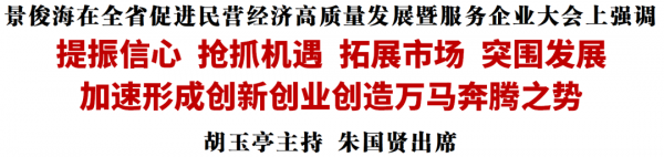 4月12日,全省促进民营经济高质量发展暨服务企业大会以视频形式召开。省委书记景俊海在会上讲话并宣布2023年吉林省“服务企业月”活动全面启动。他强调,要深入贯彻习近平总书记关于民营经济发展的重要论述和视察吉林重要讲话重要指示精神,坚定不移坚持“两个毫不动摇”“三个没有变”,在更大范围配置资源,在更广空间转换动能,在更深层次推动合作,激励企业提振信心、抢抓机遇、拓展市场、突围发展,加速形成创新创业创造万马奔腾之势,为推动吉林全面振兴提供有力支撑。省委副书记、代省长胡玉亭主持会议。省政协主席朱国贤出席会议。