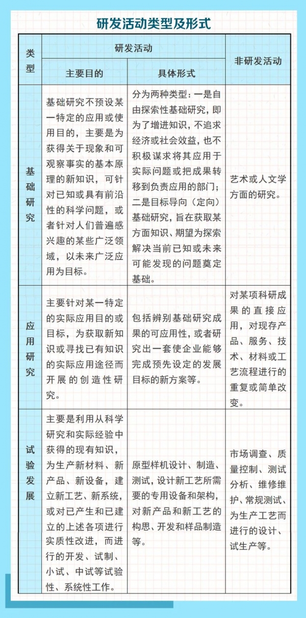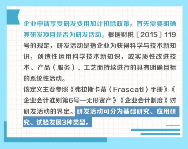 近年来,研发费用加计扣除政策持续优化完善,呈现出年年加力、步步扩围、层层递进的特点,对支持企业投入研发、鼓励科技创新起到重要作用。为帮助纳税人全方位学习了解相关政策规定,我们制作了“研发费用加计扣除政策系列图解”。今天带你了解:研发活动的概念与类型↓